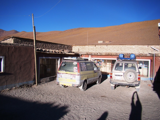 Ветер сдувает. Температура падает с 20 – 25. В машине жить — был бы дубак. Высота всё-таки чувствуется. Бегать не хочется да и задыхаешься. Когда едешь – никаких признаков высоты. Вначале мы ждали соседей, но как стемнело, я понял, что, похоже, соседей нам не подселят. Розеток нет, но в Чили случайно на рынке купил электрический патрон с 2 встроенными розетками. Вкручиваю. Закрепляю удлинитель. Включаю ноутбук. Лампа горит, а зарядки нет. Не зря же высшее электрическое образование. На лампе написано – 24 Вольта постоянки. У каждого дома солнечные батареи. Так что пишу и музыка играет на батарее, а завтра в машине – заряжу.