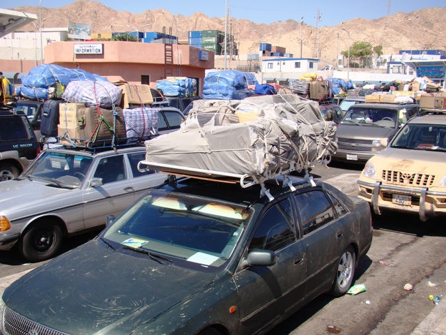 От Петры до Акабы — 140 км. Перекусили. Поприветствовали турецких байкеров на дороге и, немного поплутав, въехали в порт Акабы. Картина как обычно. Колонны гружённых авто. 3 года назад это были мерседесы — сейчас джипы и микрики. Нагружены как прежде -глобально. Такого больше нигде на планете не встречал. Билеты покупаются на 2 этаже по 60 долл с человека и 210 — за авто. Купил марки на выезд по 5 динаров, но они нам оказались не нужны — ФРИИ. Сдал марки обратно и отменил обмен долларов в сэйл офисе. Всё просто.