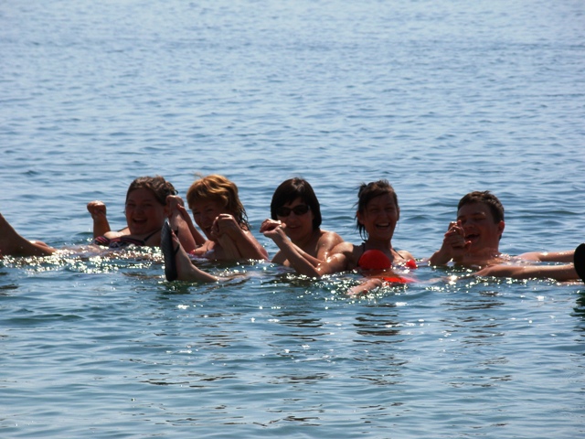 На Мёртвом море — стройка. С десяток отелей построены и строятся. На диком пляже у источников народа всего несколько машин. Мы спустились к морю. Тепло — +40. По песку можно ходить только в сланцах. Те реки и источники горячей воды на берегу моря, которые были в прошлый наш приезд — похоже пересохли. Переодеваемся и всей толпой — в море. Я сдуру решил нырнуть головой вниз. Глаза жжёт. Пока не вытерся полотенцем — радости жизни — не было. Плавать можно на спине, но сильно торчишь из воды и можно обгореть. На животе — тоже не очень комфортно. Лучше всего — солдатиком. Пытаешься утонуть, но тебя выталкивает. Такое чувство, что все стоят на мели. Нас хватило на пол часа. Что там делать дольше — неясно. Вода на ощупь как глицерин. Сверху тонкий слой холодной и, возможно, пресной воды. Наверное — из родников. Вода не охлаждает. Мне показалось, что +35.