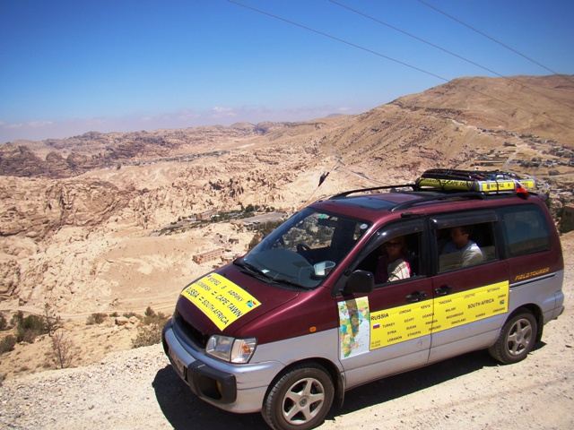 Оттуда две дороги на Петру. Одна, по которой мы ехали на мото, в конце моря направо и по серпантину. Мы поехали дальше вдоль израильской границы и потом пошли налево — на перевал. Перепад с 380 метров до 1600 м. Опять загорелась какая-то красная лампа на панели. Оказывается — это перегрев масла в автоматической коробке передач. Мы сняли переднюю обрешётке радиатора, запихнув её на багажник на крышу. Включили обе печки на обогрев салона, принудительно включили электровентилятор обдува радиатора. Температуру двигателя удаётся удержать. В общем — это не большая проблема. Так — развлечение — следить за датчиком температуры двигателя. Вроде едем в горку не быстро, но почти всех обгоняем. Значит — не хуже других.