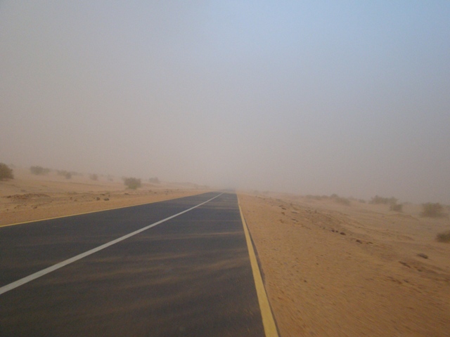 Сначала начался дождь в пустыне, потом сильный ветер, который гнал песчаную поземку, очень похожую на нашу метель. Потом было видно, как мы въехали в облако песчаной пыли с четко очерченными границами. Ветер был очень сильным и постоянно менял направление. Но нам повезло, так как он был преимущественно сзади и с боку. Говорят, что в песчаную бурю видимость падает до 5 метров — у нас было метров 100-200.