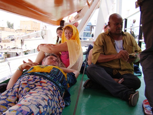 3-я. Вчером в Вади Халфе местные рассказали нам про русскую девушку. Она была обнаружена нами в интернет кафе. Каждые две минуты она хваталась за голову и повторяла, что не верит, что слышит русскую речь. Она оказалась родом с Новосибирска с Карла Маркса. Год назад переехала в Москву и автостопит 5 год. Приехала в Судан из Египта вместе с байкером — Владимиром Мининым. 2 суток без воды, по пыльной буре и в толпе негров на поезде до Хартума — говорила, что это — настоящая жесть. Потом в Эфиопии она попадала в тропические ливни, и сейчас на пароме возвращалась обратно в Египет. Жила она у местных. И когда мы встретили ее на разгрузке автомобиля — сказала, что она не смогла воспользоваться нашим приглашением в отель-тюрьму, потому что была сильно чем-то занята. Странная, как и все автостопщики.