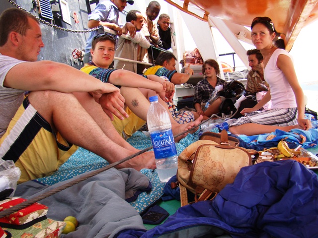 Моя молодёжь уже на пароме. Паром старинный. Загрузили в него сегодня 570 человек с багажом плюс ещё одна тихоходная баржа с шмутьём и нашими авто. Народ во втором классе сидит на лавках с кондиционерами, но запашисто немного и многие прямо там курят. Мы заняли место под шлюпкой.