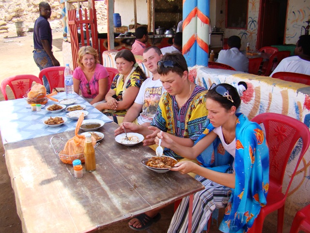 В принципе — цивилизация есть. Чай по пол фунта. 2 фунта за 1,5 литра и 8 за упаковку теплой воды. Местные пьют из кувшинов — бесплатно. Я пробовал — живой. Интернет — 3 фунта час. Не смотря на заверения, что в Судане паршивая еда — у въезда в город со стороны порта мы нашли отличный египетский ресторан. Большая тарелка жаренной баранины всего 5 фунтов, рис, тушеная картошка и хомус по 2 фунта. Были так же жаренная рыба и бараний суп. Для экзотики можно попробовать зеленое блюдо, мы съесть не смогли — очень похоже на тянущиеся сопли.
