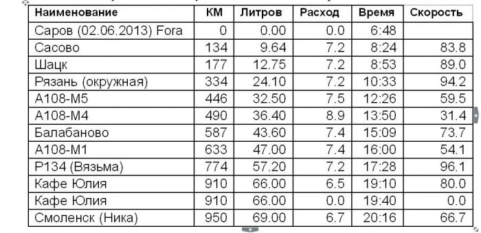 Наташа ручками вписывает расстояние до очередного пункта, общий расход топлива до этого пункта (в автомобиле имеется бортовой компьютер) и время достижения этого пункта. Excel автоматически считает среднюю скорость передвижения и средний расход топлива на конкретном участке. В дальнейшем “долгими зимними вечерами” можно делать более подробный анализ пробега, а также при повторении поездки по этому маршруту, соревноваться с самим собой в скорости прохождения маршрута. Осенью мы собираемся в Белоруссию, вот и посоревнуемся--)). Как видно из таблицы, мы очень неплохо шли до Рязани (средняя скорость составила около 90 км/час). После Рязани мы свернули с трассы с тем, чтобы подкрепиться, чем бог послал, поэтому провал в скорости передвижения на участке до А108. Еще больший провал был в районе пересечения с трассой М4. Там мы необъяснимо долго стояли в пробке на каком-то ж/д переезде. Около часа просто стояли. Непонятно. Надо сказать, что мне очень понравилось состояние дороги от Сарова до А108. За исключением очень колдобистого участка протяженностью около 10км в окрестностях Вознесенского. А108 не понравилась — узкая и загруженная, но после выхода на М1 опять набрали крейсерскую скорость. В районе Вязьмы случился проливной дождь, ливень, водопад с неба… Наиболее осторожные припарковались на обочине. А мы продолжали с песнями лететь по полосе, надеясь, что оставшиеся участники движения также хорошо видят дорогу и нас на ней, как и мы их.