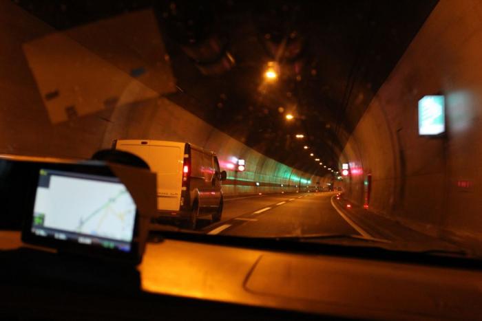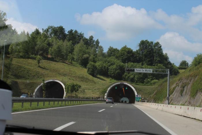На трассе в Хорватии изобилие туннелей. Как мелких (см. фото ниже), так и очень «глубоких» (до 5 км длиной). Каждый туннель имеет имя собственное. Вот туннель Святого Марко. Выход из него виден уже на въезде, но тем не менее гордо несет свое имя. В длинных туннелях навигатор теряет спутники. Это естественно. Может и «зависнуть». Так, я потерял часть общего трека. Жалко. Я свои треки храню. Потом приспособился, выключал запись трека при въезде в туннель, потом включал заново.