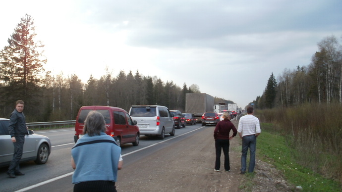 Дело было в начале мая прошлого года. Выехал рано утром из Москвы, думал — нажму газ в пол, и скоро буду в Питере… Наивный… Пришлось хорошенько прогуляться по трассе, ожидая, пока пробка не рассосётся: