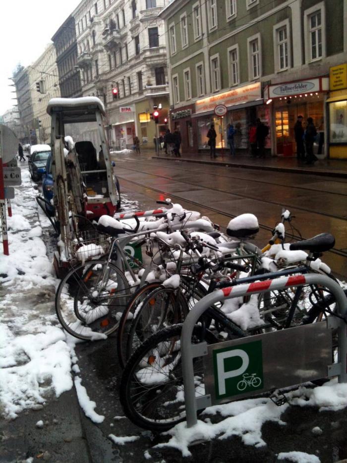 Все по немецки правильно и продуманно. Даже снег с многочисленных покатых крыш не падает (наверное чистят). По привычке все равно посматриваю вверх в ожидании неожиданной сосульки которых совсем нет, хотя температура около +-0. Зато тротуары почти не чистят, снег где растаял, хорошо. Тут же маленькими сугробами стоят велосипеды и скутера на специальных парковках.