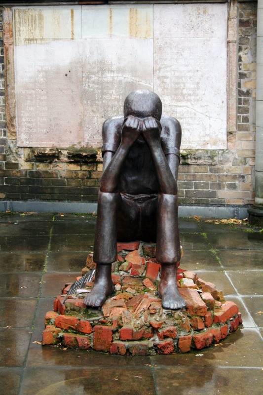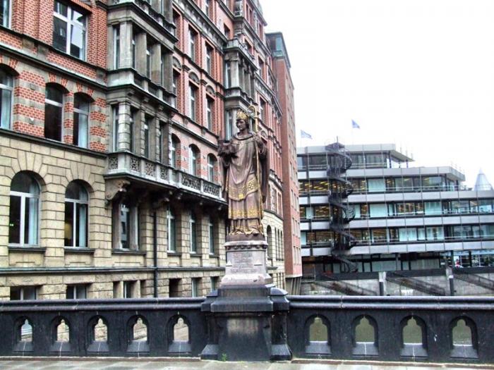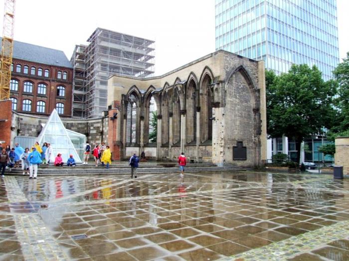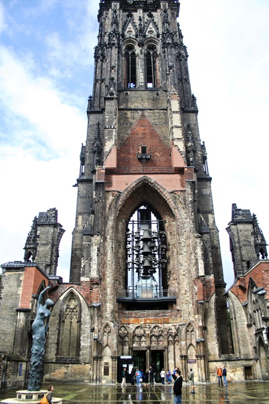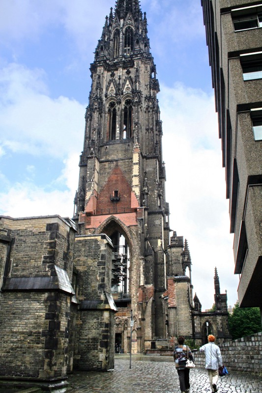 Впечатлила 147-метровая башня церкви Николайкирхе (Nikolaikirchtrum), которая осталась от разрушенной во время Второй мировой войны церкви. Она смотрелась как-то торжественно-печально, отражаясь в зеркальной плитке и булыжниках, омытых дождём.