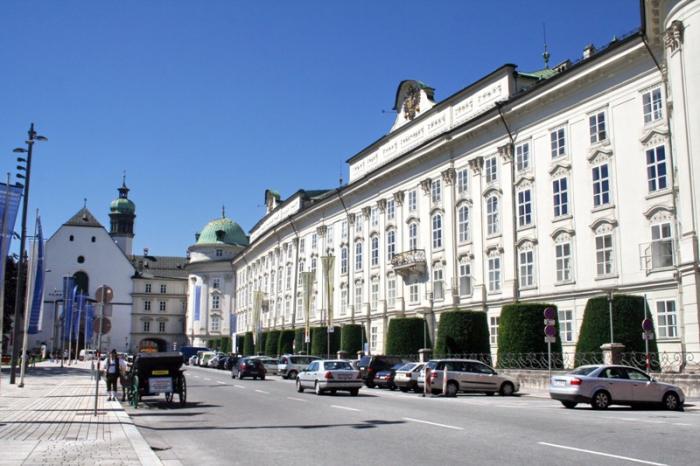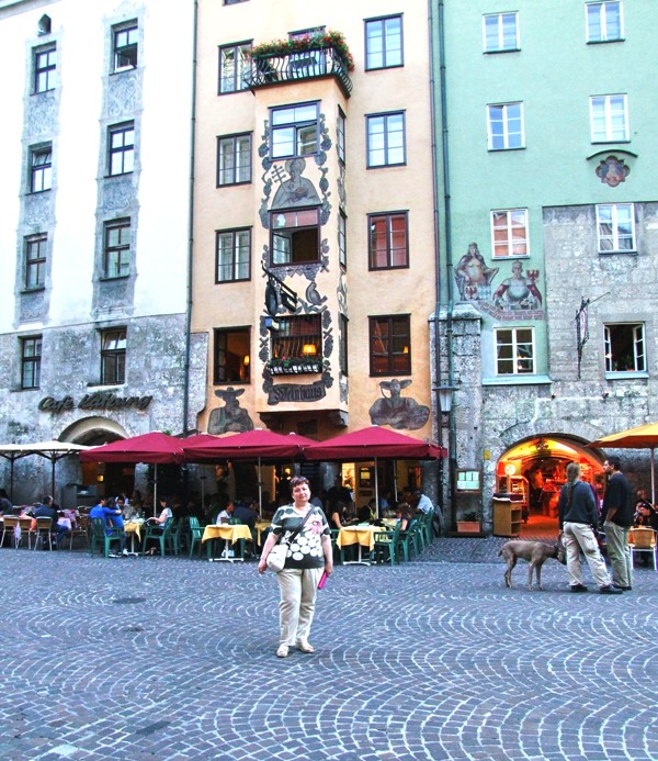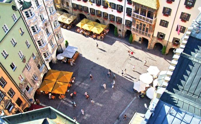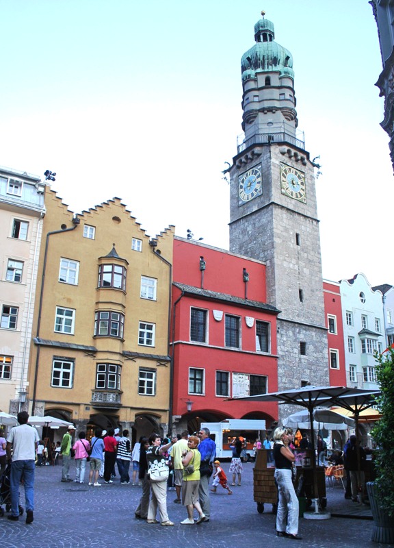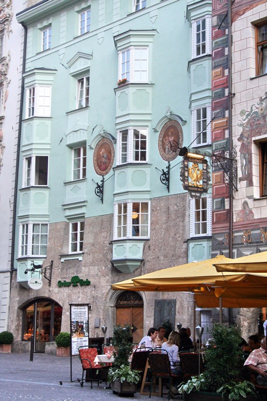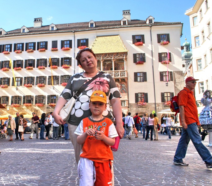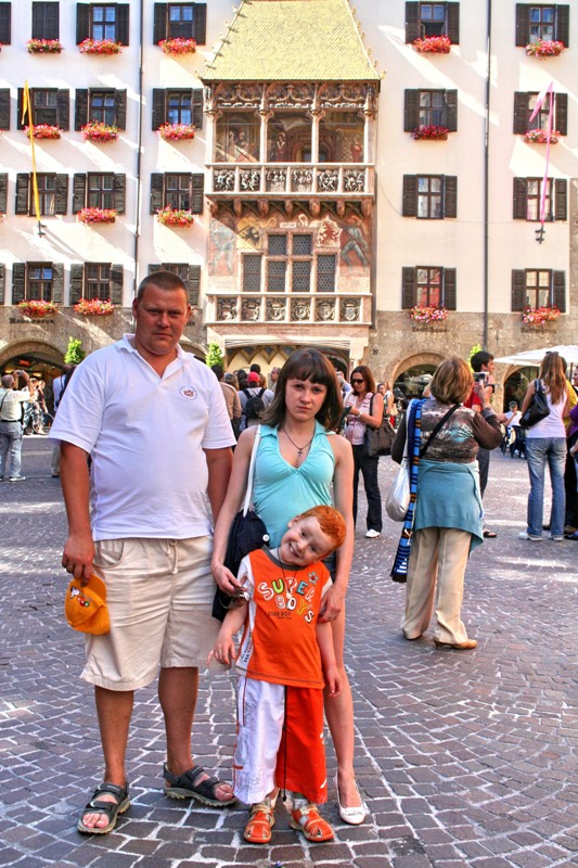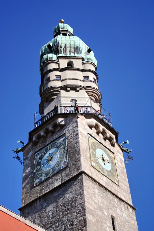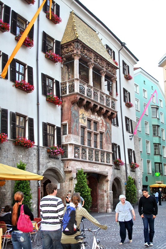 Отрицательные эмоции стёрлись, как только состоялось знакомство со старым городом – мы окунулись в мир поздней готики, ренессанса, барокко и рококо. Свою экскурсию мы начали с главного символа города – золотой крыши, которая считается самым красивым балконом Европы. Само здание было построено при Фридрихе IV в начале XV века и служило резиденцией Габсбургов. А в конце XV века по приказанию Максимилиана I (императора «Священной Римской империи») к зданию был пристроен эркер для наблюдения турниров, крышу которого украшают 2657 медных позолоченных листов.