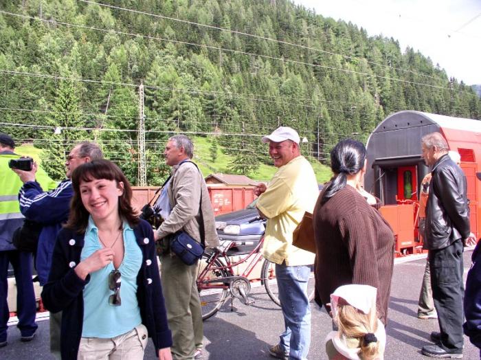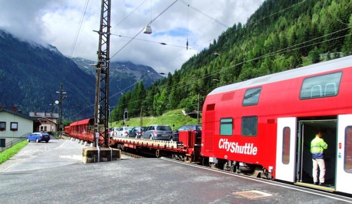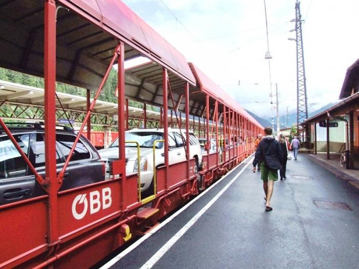 Это специальный поезд для перевозки автомобилей и пассажиров, следующих в ней. Пассажиры без автомобилей им не пользуются, поскольку до станции можно добраться только на автомобиле (по крайней мере, так было в 2008 году). Поезда в летнее время (насколько я помню расписание) отправляются каждые полчаса со станции Бёкштайн (Böckstein) и следуют до станции Мальнитц (Mallnitz-Obervellach). Станция Бёкштайн Абцв Анлауфталь (Австрия) находится в 5км от города Бад-Гаштайн (Австрия). Как написано в рассказе мы проехались по этому тоннелю по пути из Бад-Гаштайна в Порторож (Словения).