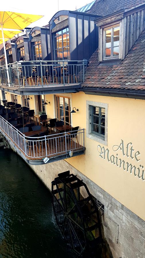 На набережной большое количество кафе и ресторанчиков. У этого — «Alte Mainmuhle» до сих пор Майн вращает мельничное колесо.