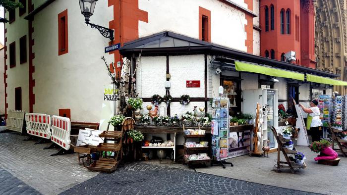 В уютных старых домиках из файхферка располагаются магазинчики сувениров и франконских подуктов.