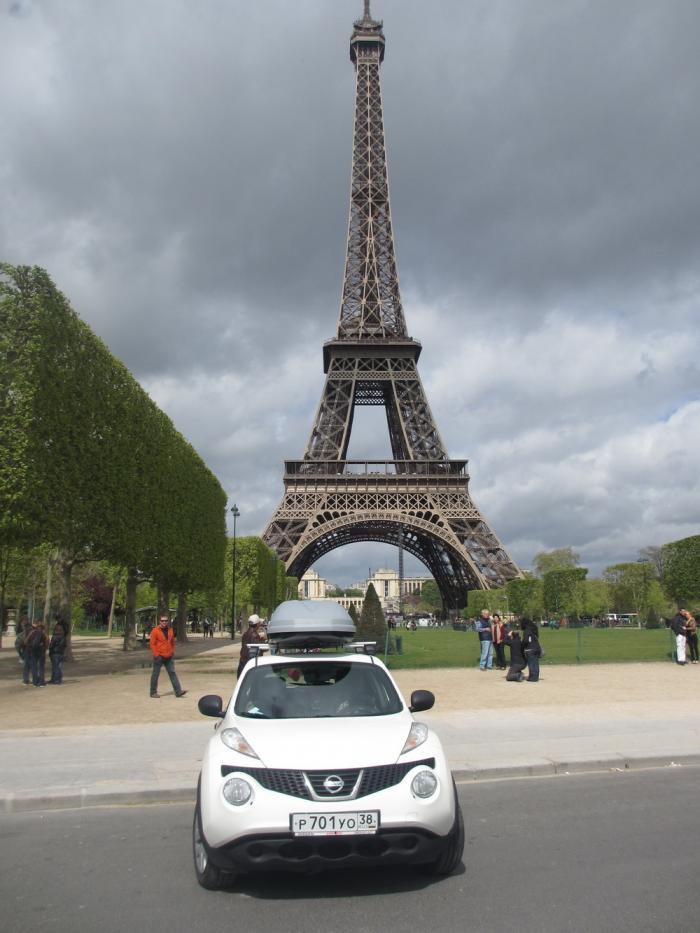 Париж встретил нас дождливым, пасмурным утром. Ветер был такой силы, что покачивало даже нашу машину, Никита забил адрес Эйфелевой башни и направился прямиком туда, расчет был прост, утро, дождь, ветер, будний день, наверняка никого народу не будет, наивные, мы еще не подозревали, что нас тут ждет. Башню заприметили издалека и уже не слушали навигатор двигались напрямую к ней, естественно соблюдая все ПДД, Никита же за рулем. Неожиданно для себя проезжаем какой то перекресток, где башня как на ладони, я конечно Никиту торможу, обзор великолепный, машин рядом ни одной, он останавливается, сейчас, говорю, сфоткаю на фоне нашего Жучка и поедем дальше и вдруг Никита замечает, знак стоянка и остановка запрещена, машина подлежит эвакуации при нарушении, что тут с Никитой началось, быстрей, кричит мне, уезжаем, срочно! А я только только сделала пару фоток, смотрю, не совсем удачные, надо бы авто по центру поставить ну и говорю ему об этом, со мной же спорить бесполезно, Никита выскакивает с водительского места, говорит, делай, что хочешь, я не с тобой и удаляется так метров на двадцать. Я развернула авто как мне надо, сделала еще несколько снимков, подозвала несчастного мужа, у него уже припадок истерии, и отъезжаем с этого места.