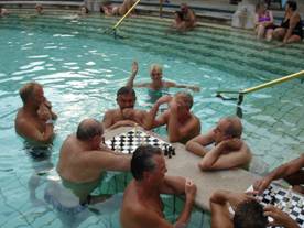 В одном бассейне вода была 20 градусов, в другом 25, а в третьем 40! В горячей воде не плавали, а просто стояли, или сидели на специальных сидениях, сделанных в бортиках бассейна. Сюда приходили лечиться. Вода лечит суставы, вены, легочные, костные и нервные заболевания. Всего списка мы не знаем, но людей, приходящих со специальными направлениями врача, пускают бесплатно. Некоторые проводят в этой воде по несколько часов. Одной из достопримечательностей таких терм, являются играющие в шахматы, прямо в воде, мужчины.