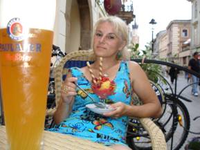 Рядом с кемпингом, в парке, был очень живописный открытый ресторан. Солнце так палило, что главное для нас было найти местечко в тени. Меню подали на английском языке. За все время ни резу еще мы не ели в ресторанах, где меню было бы по-русски. Поели мы очень вкусно: Супом со шпинатом и вареными яйцами и рыбу с разными гарнирами. Причем рыба в Польше отличного качества, без костей и очень вкусная. Саша со Светой остужались холодным пивом, а я мороженым с фруктовым сорбетом и гранатовым соком по тому, что вечером мы отправлялись в путь.
