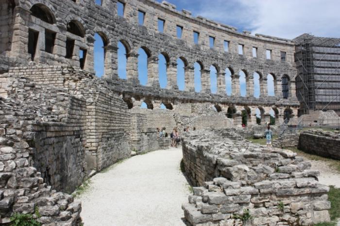 — Древнеримский амфитеатр. Был одним из шести крупнейших колизеев Римской Империи (размеры 133х105 метров), и вмещал в себя более 20тыс. человек. В середине стояли кресла, судя по всему тут время от времени проводят концерты. А в подземелье есть небольшой музей. Вход 40 кун/ взрослый, 20 кун/ студенческий, детский.