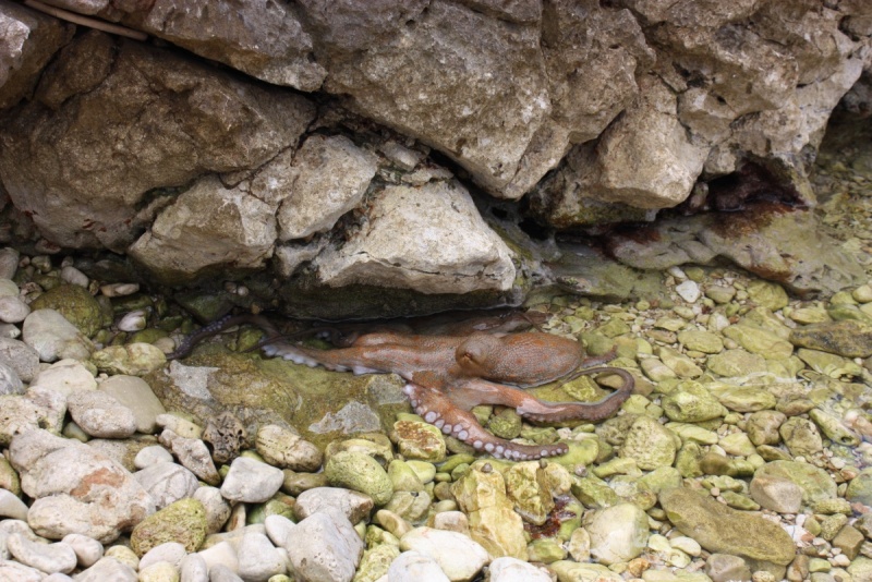 Но как оказалось 20 кун за пляж мы заплатили не зря. Мы нашли чуть ли не единственное место где можно было постелись покрывало (и то было под наклоном) и пошли окунуться, потом Наташа загорала, Леша с Ликой собирали морских ежей и ловили рыбок, а я с фотоаппаратом ходил по камням и пытался что-то интересное (кроме голой Наташи) сфотографировать. Потом все собрались возле подстилки и Анжелика начала бросать камешки в море… и тут смотрим как из под камня, где я с Лешей сидели, появилась щупальца и утащила белый камешек. Мы догадались, что под нашим камнем осьминог и последующие 10 минут мы пытались его выманить из своего логова. Последний аргумент – палка, но как только я ее взял и обернулся – за нашими спинами по камню перебирался еще один, больший, осьминожище. Который пытался удрать :) но не тут то было, я быстро и аккуратно приподнял его на палке и отдал фотоаппарат Наташе, которая и успела сделать парочку фотографий. Для нас эти морские животные вызвали полный восторг, такое впечатление, что National Geographic ворвался к нам в жизнь. Осьминога целого и невредимого отпустили восвояси. Никуда не хотелось уезжать, но нашей целью был Дубровник.