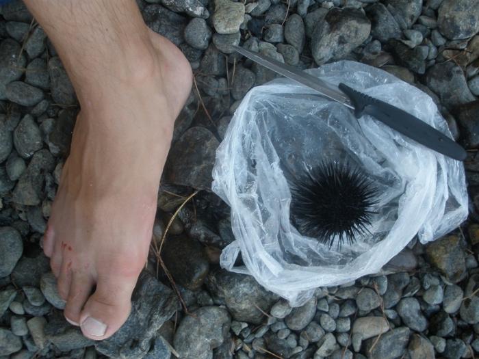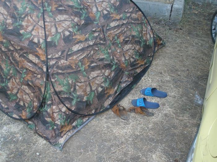 Утром обнаружили пропажу, кто- то украл один тапок, который был около палатки. Недалеко от нее тапок мы нашли, только вот в таком виде :)