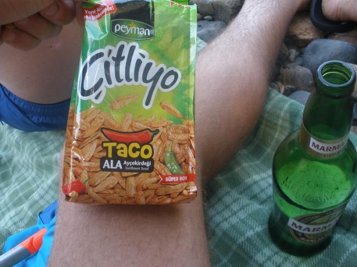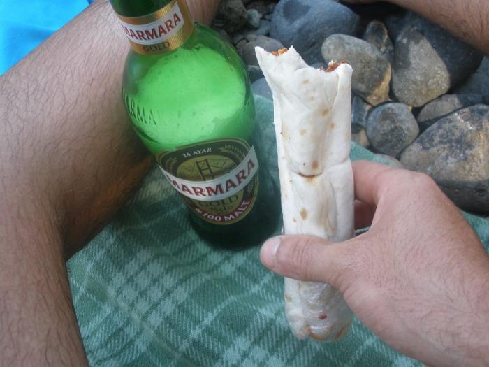 Заехали в супермаркет. Думали купить шаурму, а оказалось вместо мяса- специи и перец в лаваше, с пивом нормально и остренько.