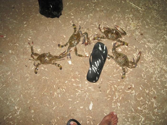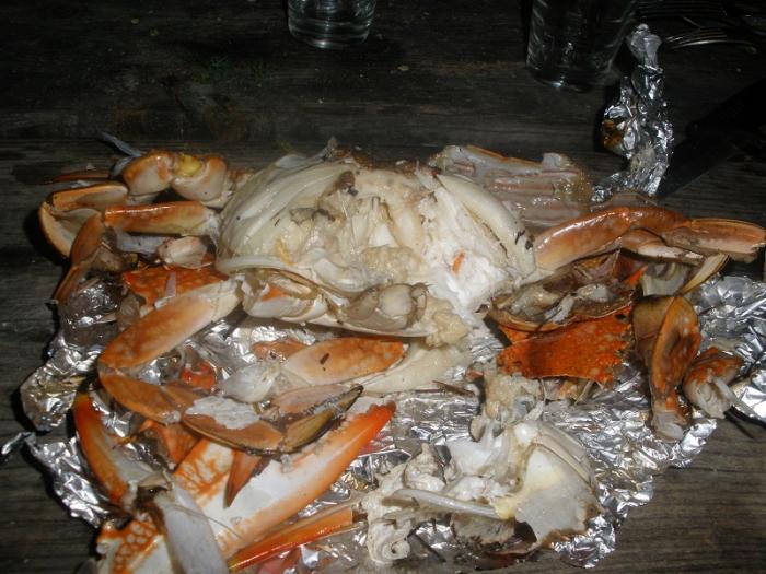 Вечером подошел наш друг, который работает в этом кемпинге и угостил нас крабами, которые он только что наловил. Рассказал, что можно в них есть, а что- нет. В них очень много мяса. Запекли в фольге.