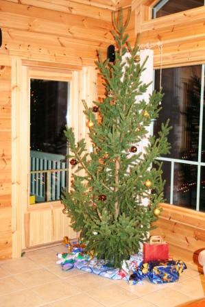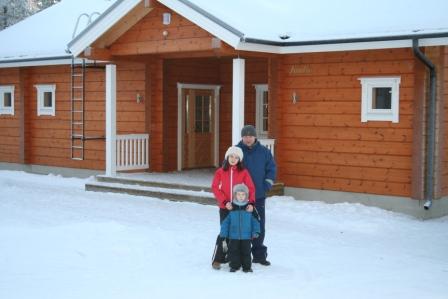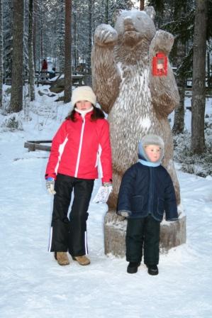 На поиски офиса горнолыжного курорта ушло совсем немного времени. Встретили нас очень любезно, опять-таки нашёлся человек, хоть и плохо, но говорящий по-русски. Нам вручили ключи, подробные инструкции по пользованию коттеджем, карту курорта, описание предлагаемых экскурсий – всё на английском и русском языках. Подробно объяснили, как доехать до коттеджа. Мы уже были готовы пробираться по лесу в кромешной тьме, но наши опасения оказались напрасными. На курорте всё продумано – от инфраструктуры до освещения. Сначала мы совершили экскурсию по огромному дому, придя в восторг от увиденного. Это был четвёртый по счёту коттедж, в котором мы отдыхали в Финляндии, поэтому у нас было с чем сравнивать. Приятно было обнаружить красивую ёлку метра два в высоту, лежащую на снегу у входа, уже с подставкой. На комоде обнаружили ёлочные игрушки, гирлянды и открытку с поздравлениями в адрес нашей семьи. Пока наряжалась ёлка, и выпекался именинный пирог, Тимофей резвился в снегу и радовался зиме. Вечер закончился вручением подарков и праздничным ужином.