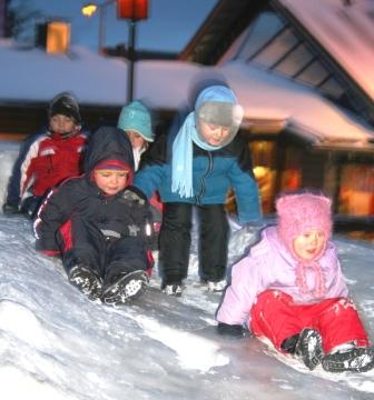 Пока дедушка и бабушка стоят в очереди, внук резвится на ледяных горках.
