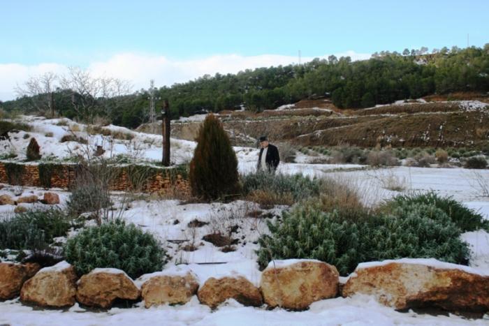 Вернувшись, обнаружили отель, клумбы с цветами и миндальные деревья, окутанные белоснежным снегом.