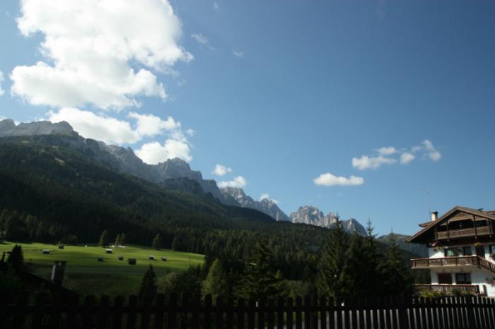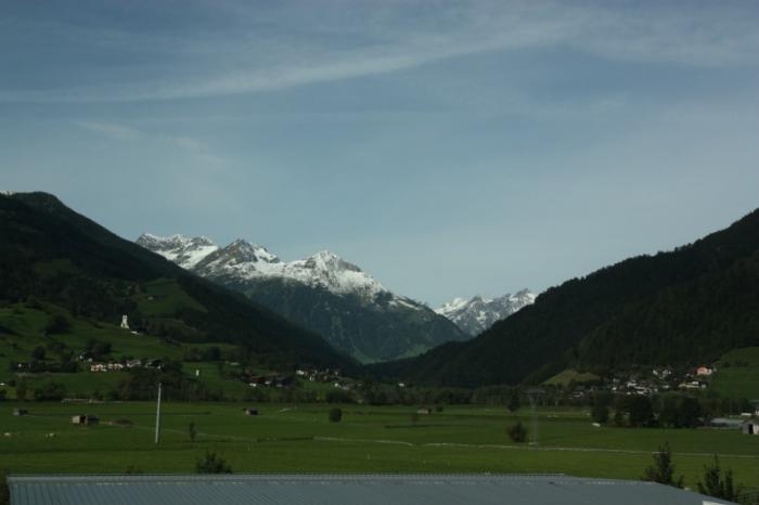 Погода и хорошее настроение способствуют позитивному восприятию окружающих пейзажей. А они чудесные, восхитительные! Горные вершины — каменистые или покрытые снегом, ровненько скошенные зеленые луга с аккуратными кипами сена, многочисленные поселки, санатории, курорты, лыжные трассы. Все дома увешаны цветами, под навесами аккуратно сложены поленицы дров. Непонятно, то ли здесь дома отапливают дровами, то ли это заготовки для бань.