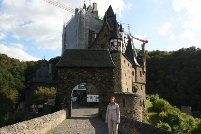 Около 15 часов с сожалением покидаем город. Понимаем, что сегодняшнюю программу не выполним, но хотя бы посмотрим замок Эльц. До Мозелькерна всего 12 км по дороге, идущей вдоль Мозеля. В Мозелькерне долго кружим по улицам, сбивают с толку указатели на домах, которые показывают противоположные направления. Наконец выруливаем на нужную дорогу, подъезжаем к автостоянке, откуда начинается пеший путь к замку. Стоимость стоянки 2 евро, однако уже поздно, автомат для оплаты стоянки не работает. Оставляем машину на халяву. Дорога к замку идет по лесу, до замка километров 5. Изредка навстречу попадаются люди, возвращающиеся из замка. Примерно через час подошли к замку. Он практически весь закрыт сеткой, замок ремонтируют, из-за этого не видно его красоты. Проход внутрь замка открыт, но во внутренние помещения уже нет смысла заходить, до закрытия осталось несколько минут. Побродили по внутреннему двору, сфотографировались. Замок производит мощное впечатление, непонятно, почему его построили среди леса, что он охранял. Возможно, раньше здесь проходил торный путь, было с кого получать проездные и проходные.
