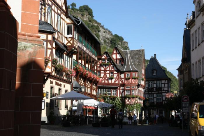 Город похож на большую игрушку. Небольшие аккуратные фахверковые дома, магазинчики с сувенирами, каменная мостовая. Везде на домах и около домов цветы, цветы, цветы. Улицы узкие. Тем не менее, по ним ездят машины, да и еще умудряются разъезжаться. Прошлись по центральной улице туда сюда несколько раз, надолго впитывая в себя необычайно привлекательный аромат города. Долго стояли возле старого дома (Altes Haus), которому более 500 лет. Отпущенное нами нам время для общения со сказочным городом подошло к концу. Собравшись вместе, пошли к машинам, пора дальше в путь. По пути к стоянке зашли в винную лавку Jost, где купили на память о чудесном Бахарахе несколько бутылок местного вина.