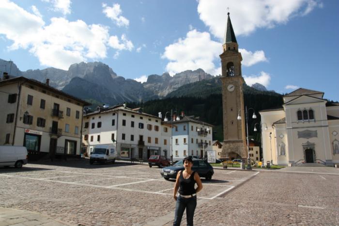 Машин немного, никто нас не торопит. У городка Auronzo di Cadore ущелье перегораживает плотина высотой с сотню метров. За плотиной рукотворное озеро с водой грязно-стального цвета. В городке остановились на центральной площади, сфотографировались на фоне гор.