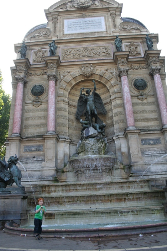 По улице Юшет дошли до площади Сен-Мишель. Пофоткались на фоне фонтана Святого Михаила, вспомнив, как в нашу прошлую поездку, какой-то умелец налил в него шампунь, отчего чаша фонтана напоминала джакузи.