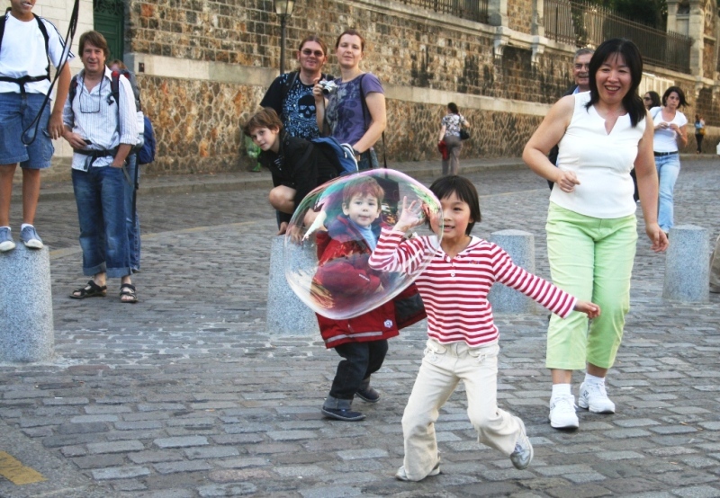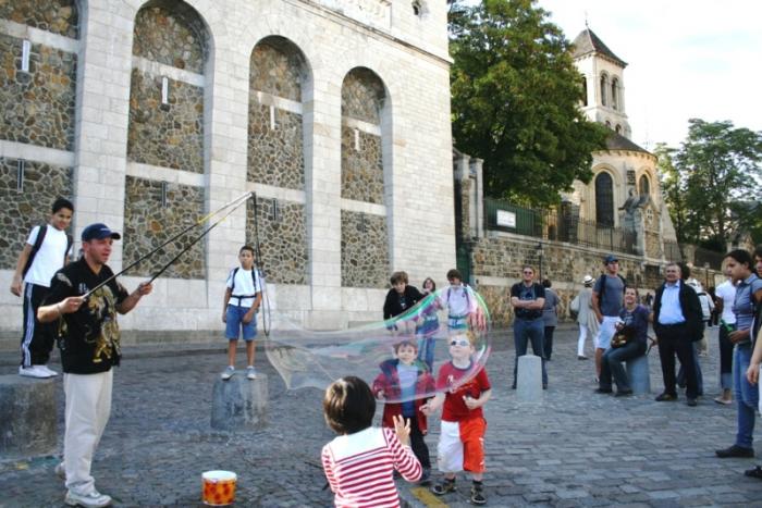 Заставив себя покинуть это удивительное место, направились в сторону площади Тертр и тут же наткнулись на уличного шансонье и умельца, ловко управляющегося с гигантскими мыльными пузырями.