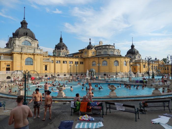 Рядом с Зоопарком находятся Купальни Сечени, туда мы и направились. Взяли одну кабинку на семью за 18 евро. Вообще Будапешт считается столицей лечебных термальных вод. А купальни Сечени являются самым большим термальным комплексом в Европе. Здесь 5 бассейнов и 11 купален с термальной водой. На улице 3 больших бассейна: один из них с термальной лечебной водой +37 (достаточно 20 минут и как заново родился), 2-й бассейн с сюрпризами — подводные гейзеры, водопады, массажные струи, карусель с мощным потоком (не удивительно, что здесь больше всего молодежи, в т.ч. китаааайцев, они же ходят только толпой), 3-й бассейн с дорожками. Внутри много саун с разными температурными режимами, эфирными маслами или купальни с ледяной водой.