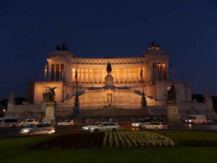 Вечерний Рим очень красив, но надолго задерживаться мы не могли, надо ещё вернуться в кемпинг до 23-00. Кстати, в кемпинге две парковки: одна возле ресепшна под охраной со шлагбаумом, а другая через дорогу. Когда мы разгрузили вещи в шале и хотели машину поставить на парковку через дорогу, к нам сломя голову подлетел охранник и стал по итальянски объяснять, что тут лучше не ставить, иначе будет «вандализм». Всем будет спокойнее, если мы будем под присмотром, но возвращаться необходимо до 23-00. ОК.