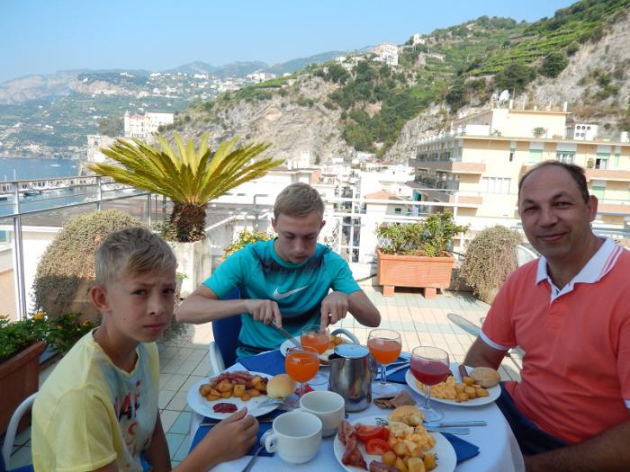 Хочу сказать в Майори отдыхает довольно много русскоговорящих. Когда мы искали , в котором надо было зарегистрироваться, я спросила на английском (наверное с жутким акцентом) проходящих молодых мужчин где находится такой-то отель. На что мне, на чистом русском ответили: «Сами мы не местные, но где-то дальше по проспекту». Вместе посмеялись и разошлись. На пляже потом познакомились с молодой украинской парой с ребёнком. В отеле где проживали тоже встретили несколько рууских семей из Москвы и Перми. Наверное поэтому молодой итальянец регистрировавший нас в Hotel Panorama сказал, что усиленно учит русский язык и каждое утро перед завтраком мы с ним немного общались. Так он тестировал свои новые знания в русском языке.