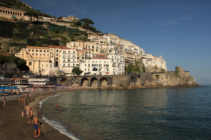 Итак, почему мы выбрали г. Майори для отдыха на море. Самые большие пляжи Амальфитанского побережья находятся именно в Майори. Пляжи песчаные с примесью крупного черного вулканического песка, правда ближе к обеду песочек сильно прогревается, спасают только деревянные настилы. Набережная длинная — есть где прогуляться. Вдоль неё разбиты цветники, фонтаны, растут пальмы…