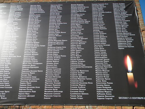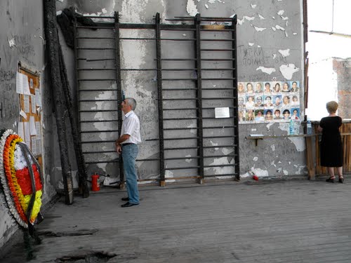 стенах спортзала, где держали заложников, — фотографии всех погибших. Непрерывный, отчаянный, надрывный женский плач, рядом