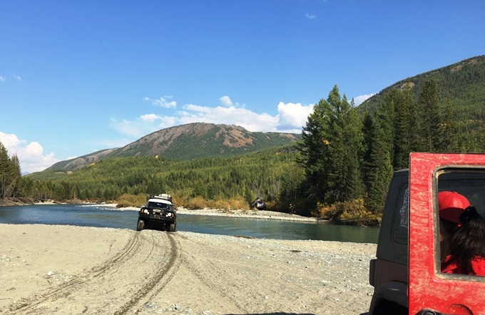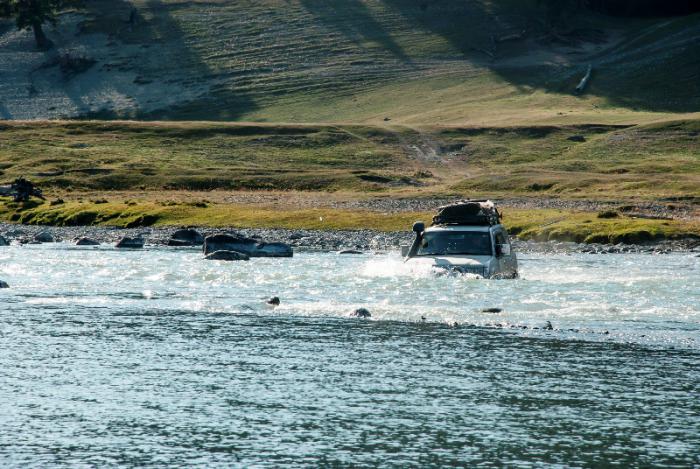 Чтобы вновь попасть в степь Самаха, нам нужно было проехать по опасному прижиму с выступающим валуном, который заставил нас так поволноваться два дня назад, по пути сюда. Решили не рисковать критичными наклонами высоких Крузаков и переехать реку по броду, по которому переправляются грузовые машины. Немного поплутали в его поисках, а когда уже нашли, рядом обнаружилась и указующая на переправу табличка, сбитая то ли ветром, то ли неловким или сильно нетрезвым водителем.