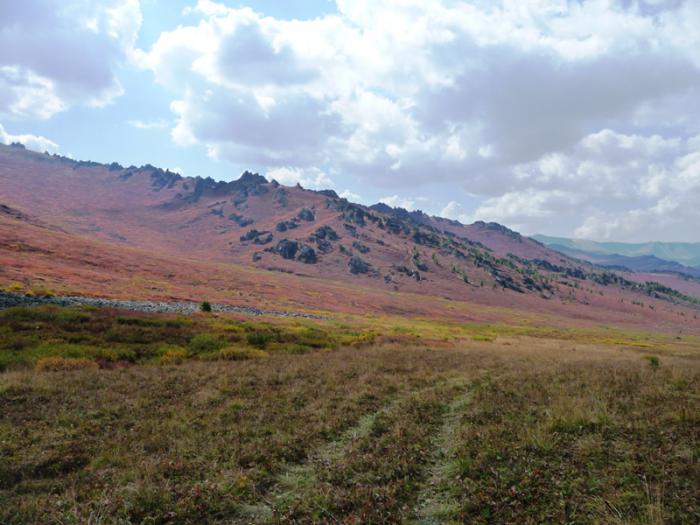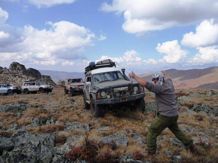 Перед россыпью остроконечного курумника нашли свои следы и попытались повторить вчерашнюю траекторию движения. Там, где уже прошли колеса автомобилей, наиболее острые верхушки камней были сбиты и обломаны. Продвигались значительно спокойнее, но все же очень и очень осторожно. Тут, как говаривал М.М. Жванецкий: “Одно неверное движение – и ты отец!”. А в нашем случае, очередная порванная покрышка, запаса которых уже и так нет. Но бог миловал, прошли без повреждений. Плюс к тому, видно штурманы “набили глаза и руки”, увереннее выбирая максимально правильный путь.