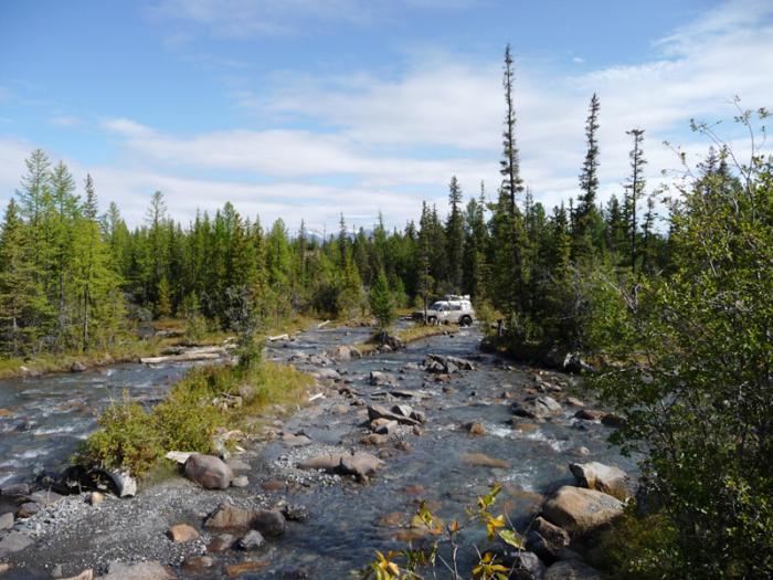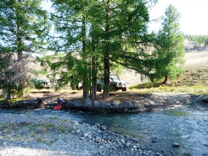 Через пять километров после старта, остановились на берегу живописной речки Корумду, бегущей среди лиственниц и елей, чтобы набрать экологически чистой, прозрачной питьевой воды в канистры.