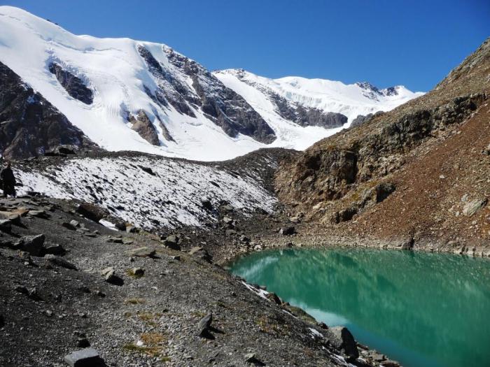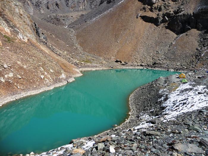 Примерно через километр перевалили через моренную гряду справа от ледника, после подъема на которую нам и открылось Голубое озеро. Находится оно на высоте 2840 м. На берегу приютилась хижина гляциологов Томского университета и с десяток палаток ушедших ранним утром на восхождения альпинистов.