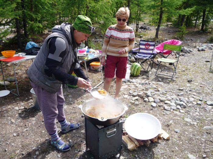 В шумящей рядышком речушке устраиваются постирушки и, постепенно наша полянка, украшенная разноцветными футболками и штанами, словно флагами, приобретает “фестивальный” вид. На одной из машин пробежались до кемпинга “Сачки”, расположенного на берегу одноименного небольшого озерца и приобрели у местного завхоза несколько поленьев дров. И вот уже, кашевары колдуют над разборной печкой кантемировской конструкции, а вокруг разливается дух неторопливого блаженства и неспешного отдохновения.