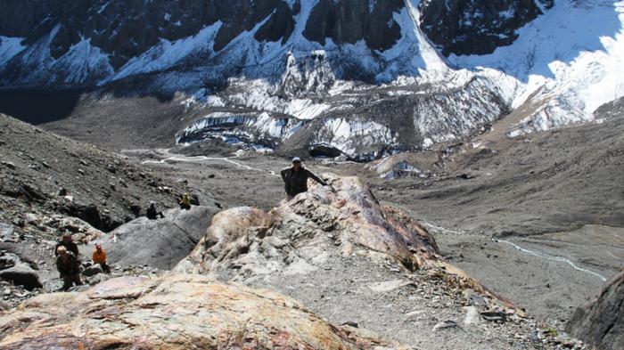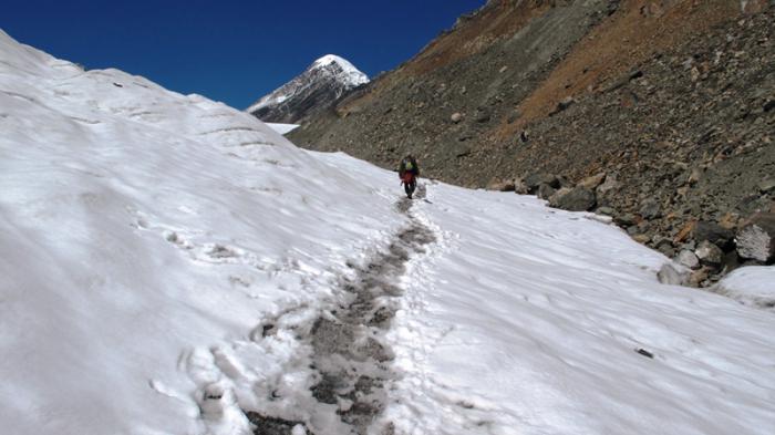 Понятно, что Эвересты у каждого разные. Одно радует — погода стоит сухая, по мокрой тропе взбираться здесь было бы гораздо сложнее. Наградой за потраченные усилия послужила возможность, сразу после скального взлета, прогуляться по белоснежному пологому языку ледника, поскрипывая свежим снежком. Что мы с удовольствием и сделали.