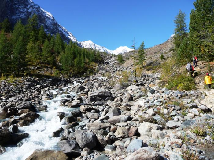 Тропа петляет по крупным серым камням довольно продолжительной морены, через которую промыла своё русло речка Актру. В первой своей части подъем совсем простой, проходится прогулочным шагом. Вымотал и забрал массу сил очень крутой взлет на Бараньи лбы – две округлых скалы, действительно чем-то напоминающие упрямых баранов или каменных сфинксов, перегораживающих доступ к леднику. Чтобы преодолеть их пришлось изрядно попотеть и попыхтеть, карабкаясь по склонам крутизной порядка 70 градусов по сыпухе.