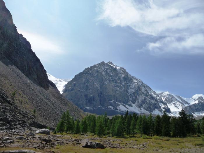 Вот и мы в девять часов утра встали на тропу, ведущую к леднику Большой Актру. Тропа хорошо набита и толково промаркирована. Начинается она от памятника альпинистке Галине Афанасьевой, погибшей на леднике при восхождении на вершину Кызылташ. Интересна история появления здесь “Памятника альпинистке.” Инструктор Бийской альпинистской школы, Галина Афанасьева проводила учебное восхождение первой, самой простой, категории сложности, с молодыми ребятами, начинающими альпинистами. Не рискуя группой, в одиночку отправилась на разведку безопасного пути и погибла на непредсказуемо подтаявшем после жаркого лета леднике.