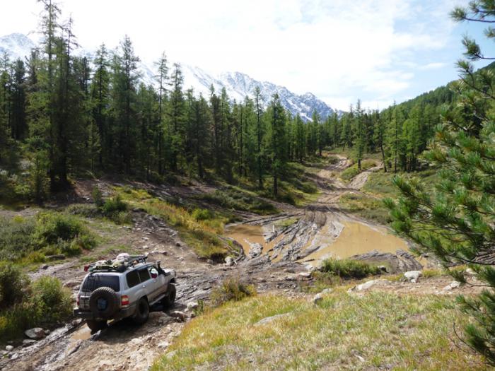 Сразу за бродом — развороченная колесами крупной техники колея с каменными выходами и грязевыми ваннами. Поднимаемся мы медленно, но уверенно, переваливаясь с валуна на валун и местами проваливаясь в лужи и жидкую грязь.