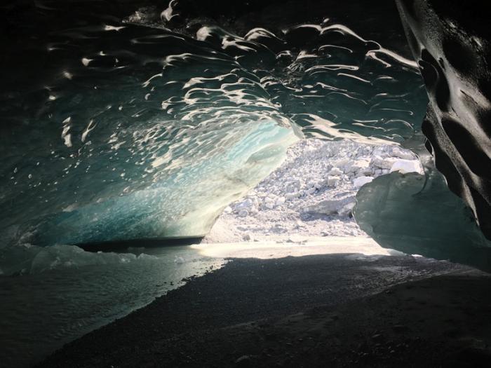 Впрочем, вначале все выглядело достаточно прозаично — река берет свое начало из просторной пещеры, примерно метров десять в диаметре. С верхней кромки беспрерывно срываются капли воды, падают мелкие камушки и осколки льда.