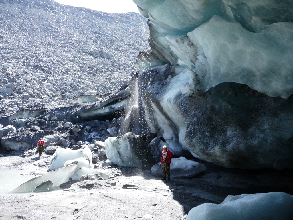 Река Талдура вытекает из двух языков нижнего края ледника, кровля которых усыпана песком, мелкими серыми осколками породы и больше похожа на курган мокрой грязи. Правый ручей вытекает из-под небольшой трещины, чтобы к ней подобраться нужно бродить мутные воды, поэтому уходим за поворот, вверх по левому притоку.